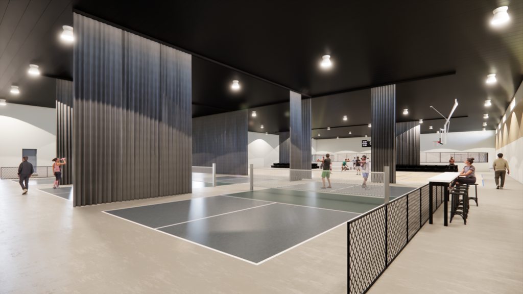 Le deuxième scénario met aussi aux normes le bâtiment actuel, mais le transforme en centre multisport comme on le connaît depuis 2024, avec des surfaces de pickleball, de dek hockey et multiusage.