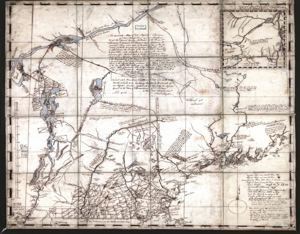 Vers 1700, voies utilisées par les autochtones pour rejoindre la Nouvelle Angleterre. En haut : fleuve Saint-Laurent, le lac Saint-Pierre et la rivière Saint-François. En bas la Nouvelle-Angleterre.