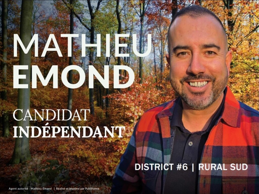 Bonjour à vous, je me présente : mon nom est Mathieu Emond et je suis candidat pour le poste de conseiller du district #6 pour les élections municipales du 2 novembre prochain.