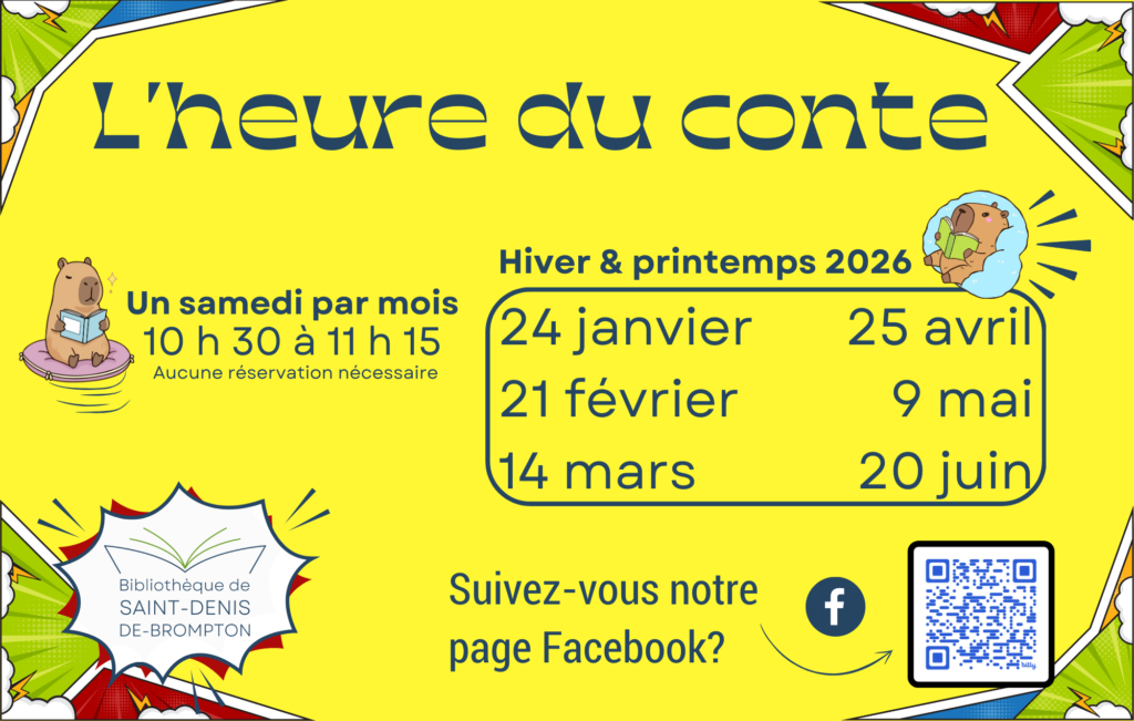 Aucune réservation nécessaire. Une fois par mois, votre enfant pourra apprendre et découvrir en explorant de nouveaux univers durant L’HEURE DU CONTE. Bien que destinée principalement à un public de 3 à 6 ans, L’HEURE DU CONTE accueille les enfants de tout âge. Le conte est habituellement suivi d’un bricolage (matériel fourni).
