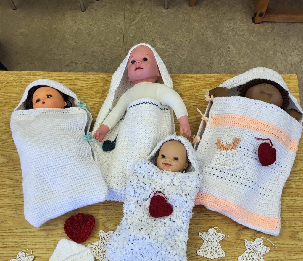 Pour ce qui est de nos activités, les tricoteuses, tous les jeudis en après-midi, ont tricoté/crocheté des « Nids d’anges ». Ce sont des petits nids (sac de couchage) en laine pour les enfants, fœtus mort-nés. La perte d’un enfant, peu importe à quel moment de la grossesse est une grande épreuve à traverser. Nous espérons qu’en voyant leur petit trésor pour la dernière fois dans ces Nids d’anges, sera un petit baume pour leur peine. Ces petits nids d’anges seront accompagnés d’un cœur et/ou d’un ange. Nous remettrons ces Nids d’anges au CHUS.