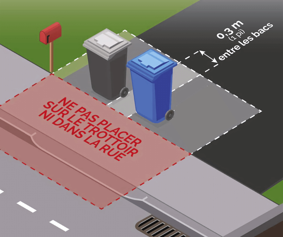 Afin d’améliorer les services municipaux offerts aux citoyens et leur efficacité, la Municipalité rappelle l’importance de positionner vos bacs dans votre entrée, à 2 mètres ou 6 pieds de la rue. Si vous les positionnez trop près de la rue, les chances sont fortes que la déneigeuse les renverse ou encore que la vague de neige propulsée par la déneigeuse les fasse tomber.